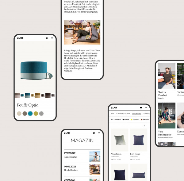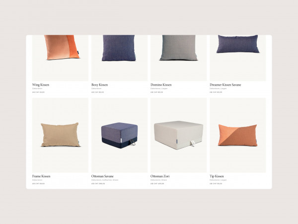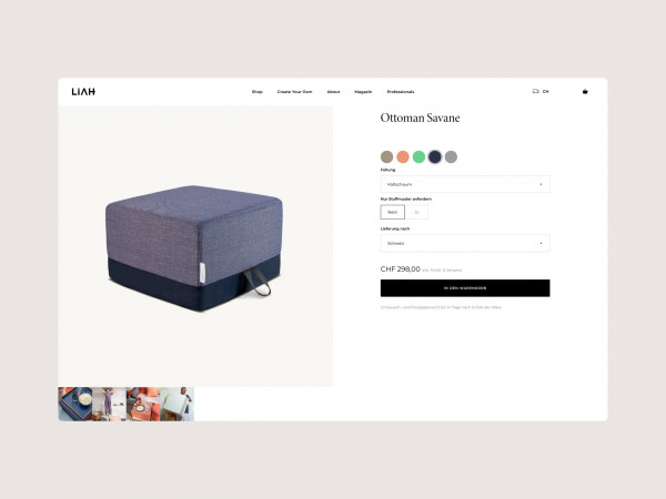 For Zurich-based company LiAH we designed a webshop with a product configurator for bespoke soft furniture. In line with classic Swiss design principles we designed a simple yet effective UI to keep the myriad of configuration possibilities as accessible as possible.