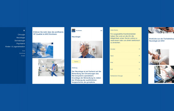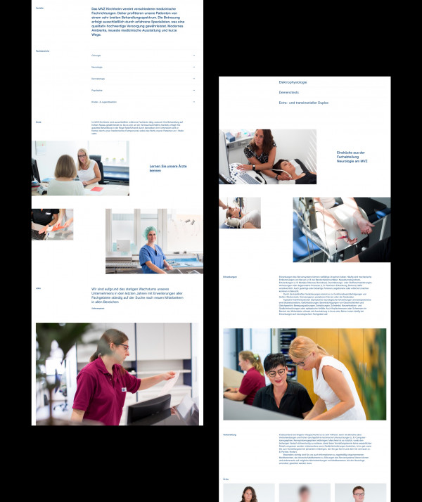 Healthcare Center MVZ Kirchheim unites 6 medical departments under a single roof. We were approached to solve the following tasks: A) Make the medical offerings understandable B) Improve overall usability and increase visibility of essential content C) integrate a digital booking engine to relieve administration. The existing identity was incorporated into a contemporary, minimalist web experience.